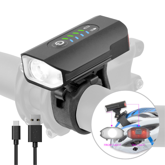 - predné & zadné svetlo 2 v 1 s bezpečným režimom, 600 Lumen, 1 Super LED dióda biela + 2 LED diódy červené CREE XP-G3 LED, kapacita batérie: 1200mAh Li-pol, doba prevázky: predné svetlo: 100% stále svietenie (2h+1 (2,5h+1h bezpečný režim)-50% stále svietenie (4h+1h bezpečný režim)-25% stále svietenie (8h+1h bezpečné obdobie), pomalé blikanie (8h)-SOS (8h), zadné svetlo (dvojité kliknutie): 100% stále svietenie, pomalé blikanie - d) je batéria vybitá, svetlo sa automaticky prepne do núdzového režimu 30 lúmenov a vydrží ďalších 30 minút, indikátor napájania: 100% -75% -50% -25%, vodotesnosť IP65, hmotnosť (s držiakom): 90g, veľkosť 71 x 46 x 27 mm, obsah balenia: svetlo GOPRO MOUNT03, GOPRO HOLDER04, USB C kábel
